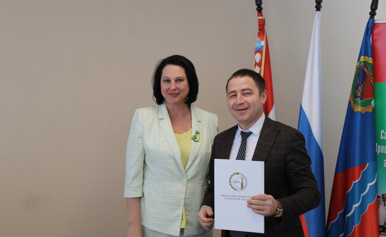 Наталья Сергеевна вручила Ильдару Рафаилевичу Галиеву - помощнику губернатора Самарской области по развитию Сызранского района и городского округа Сызрань юбилейную Почётную грамоту Федерации профсоюзов Самарской области за большой вклад в развитие профсоюзного движения Самарской области.